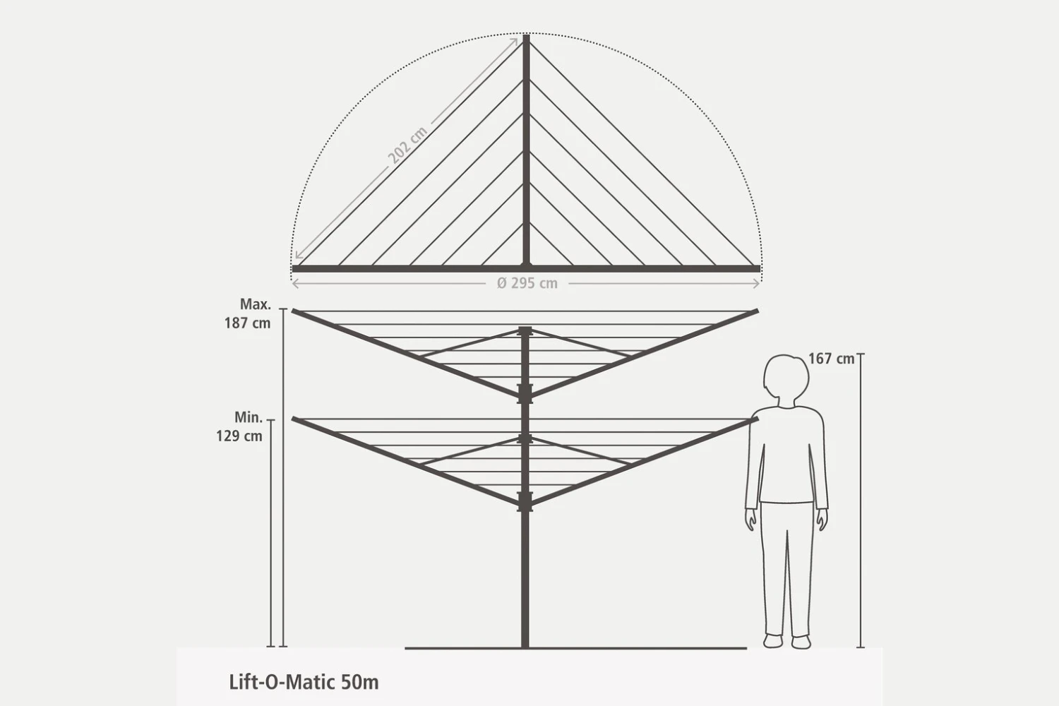 The smart Lift-O-Matic system adjusts the dryer height to match your ideal working height. The smoothly rotating arms on this rotary mean there's no need to carry your washing basket around. The non-slip, UV resistant washing line stays taut at any of its three positions. All arms have special holes for hangers and the rotary has a sturdy hanging loop for easy storage. Comes with soil spear, cover, peg bag and pegs. Size when open H187, W295, D295cm. Please note that this item comes with a ground spike Only – concrete tube not included.