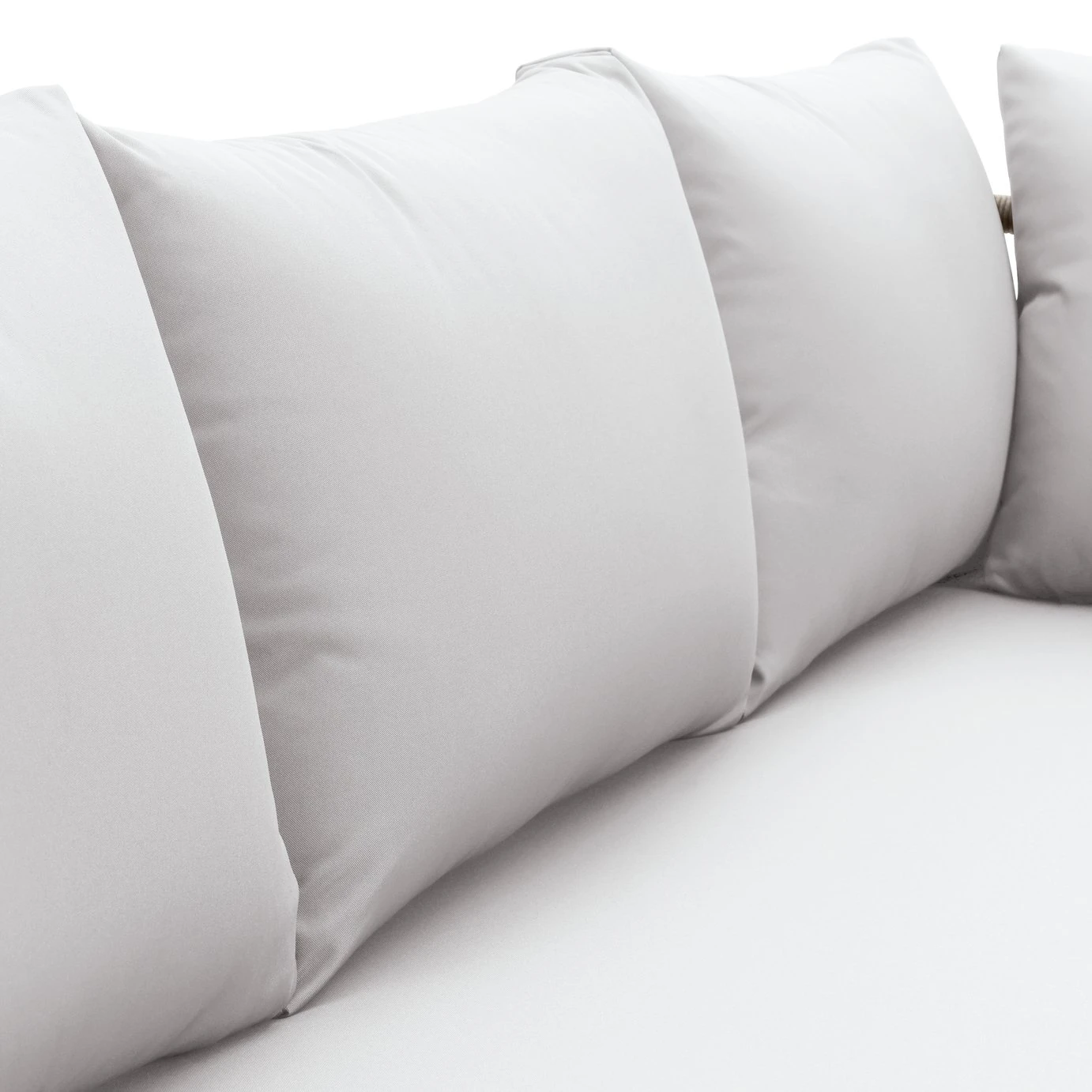 Corner the market in stylish garden furniture. Create a relaxing family size set up on your patio with this 5 seater corner sofa and matching glass top coffee table. Strong and smart. The natural frame is made from steel, and the rattan like rope is handwoven into a loose diamond weave. Comes with 8 comfy cushions, all with removable, washable covers. Gather round and enjoy.