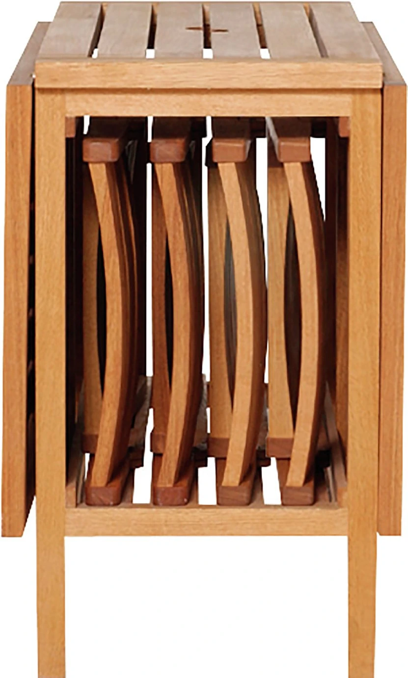 Get out there. Our Zeno table transforms your garden or deck into an alfresco dining spot. Simply flip open both sides of the table and voila! a table for four. It even has a handy shelf at the bottom for extra plates, condiments or other storage. This great value set is made from hard eucalyptus wood and includes one table and four chairs. And when the party is over simply fold it all up and use the table wheels to store away in a flash. Save space, have fun.