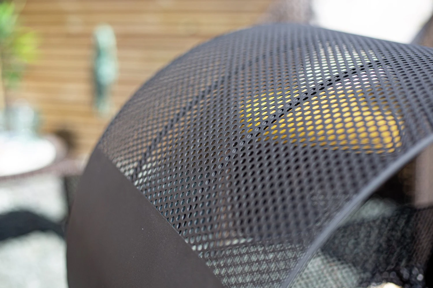 Durable steel construction High temperature black paint finish Contemporary perforated designs Double sided fireplace Includes log store.