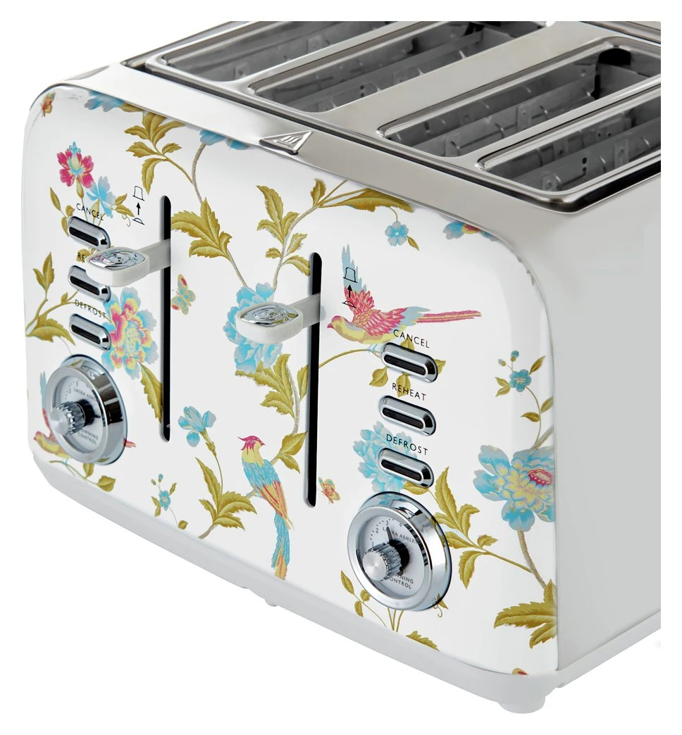 If you're looking for a multi-functional toaster that not only makes the perfect toast but can cook tasty bagels, luscious crumpets, and wholesome thick-sliced bread then look no further! The Laura Ashley 4-Slice Toaster is the perfect match to make your breakfast and style your kitchen at the same time. The power output rages between 1550-1850 watts.