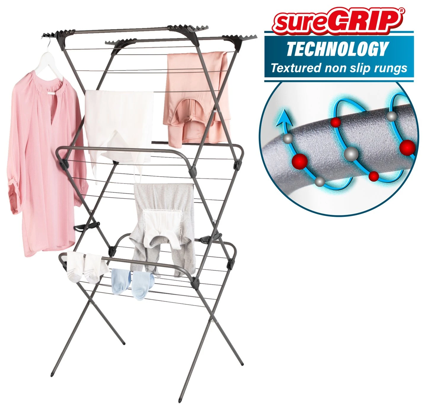 With textured non-slip rungs, the revolutionary Sure Grip technology holds garments firmly in place to prevent items sliding off even when the airer is moved or when drying outdoors in the breeze. Thanks to its rust resistant properties, the non-slip technology provides weatherproof protection, making it perfect for indoor and outdoor drying. The airer opens in seconds and features 21 metres of hanging space, comprising 15m of rungs plus 4 flip out corners that can hold 12 extra-long hanging items. Whilst not in use, it folds away neatly.