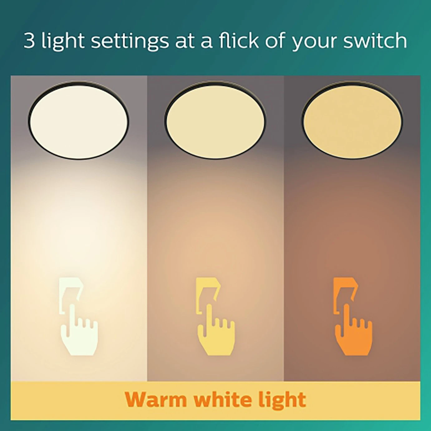 Superslim is a ceiling light from Philips, which emits a pleasant warm white light. The ultra-thin lamp uses Philips Sceneswitch technology. You can easily choose from three different lighting settings via your current wall switch, you do not need a dimmer. The ceiling light has an integrated memory clip that reminds you of the last selected lighting setting when the lighting is turned off for more than 6 seconds.