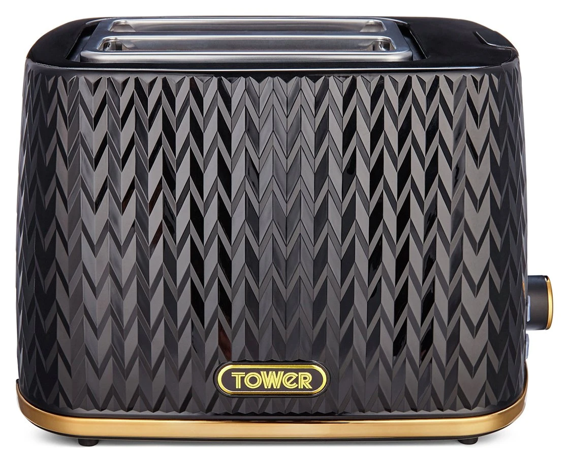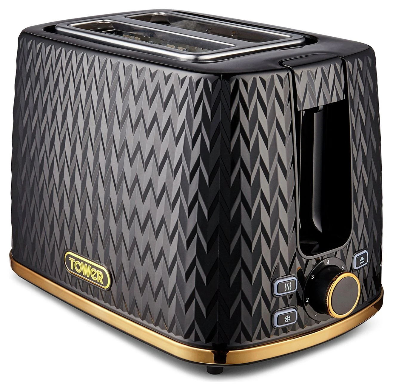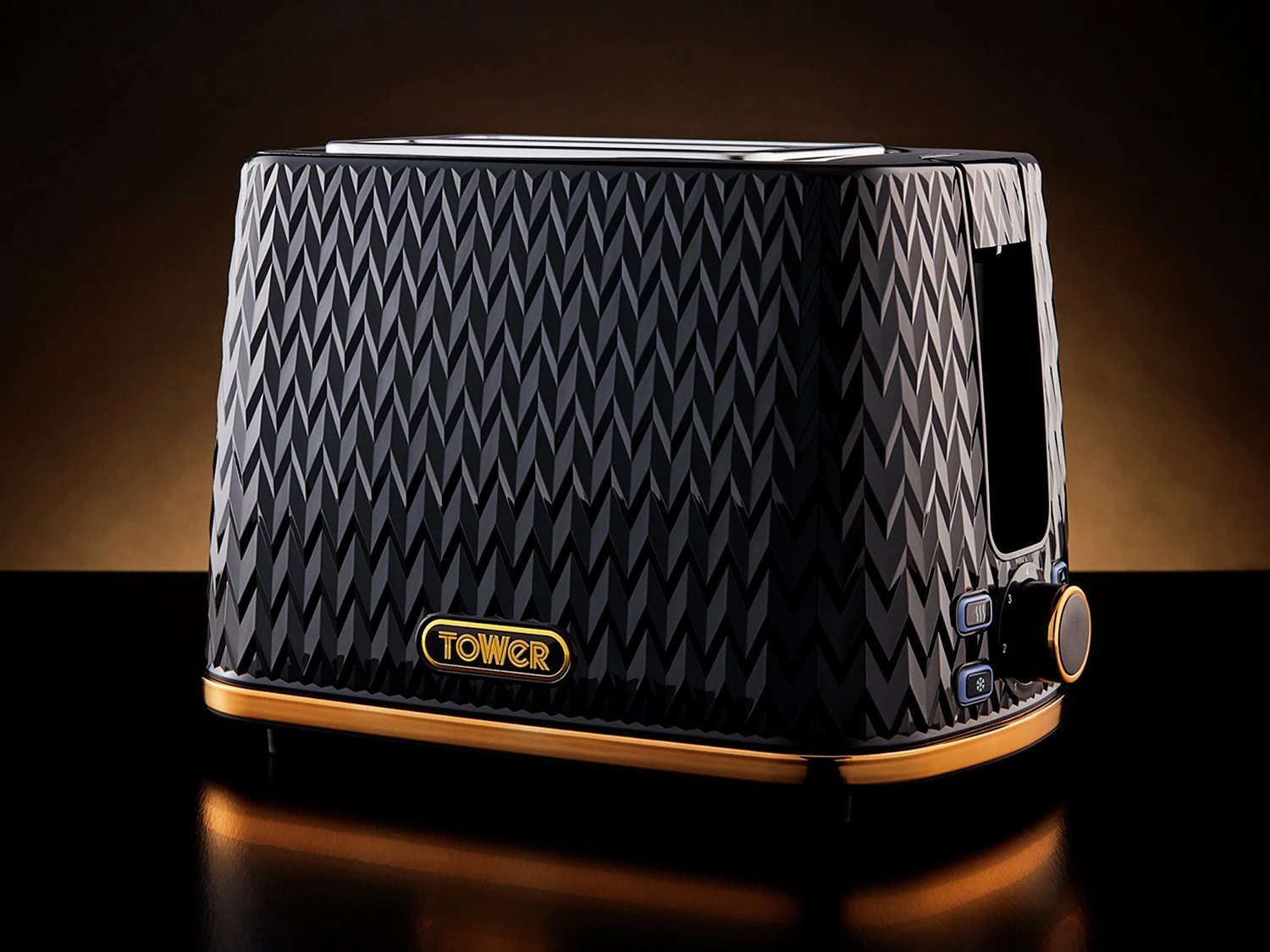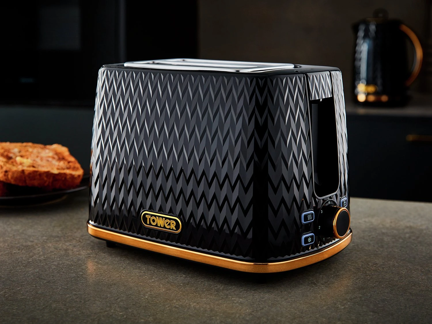 Empire patterned black coated 2-slice toaster with bronze accents. 2 toasting slots provide enough space for various sized loaves; while the adjustable browning control's 7 different settings lets you select your ideal browning consistency. The self-centring function provides even coverage during toasting. The defrost and reheat options provide complete control, with an anti-jam function and an automatic turn off function for safe operation. The removable crumb tray and integrated cord storage provide easy cleaning and neat storage after use.