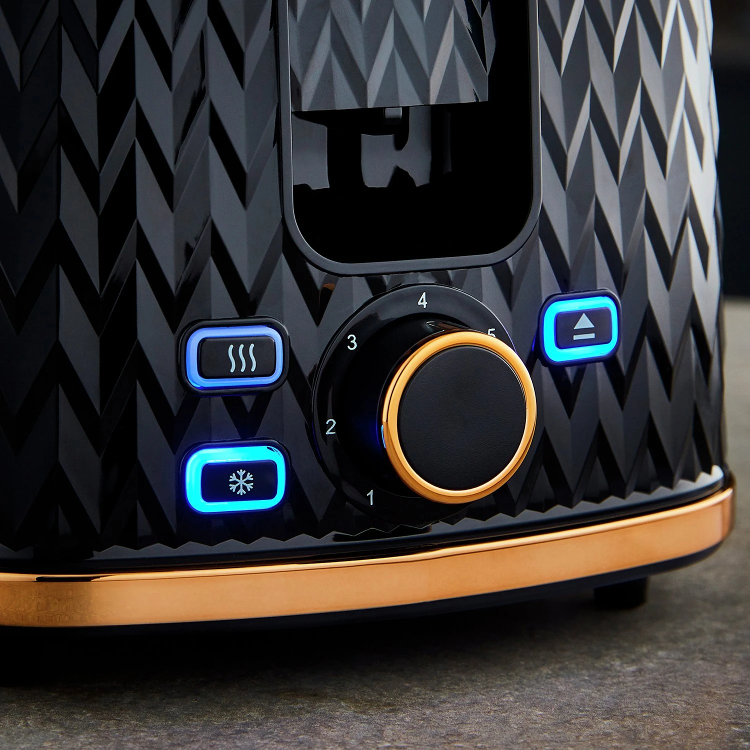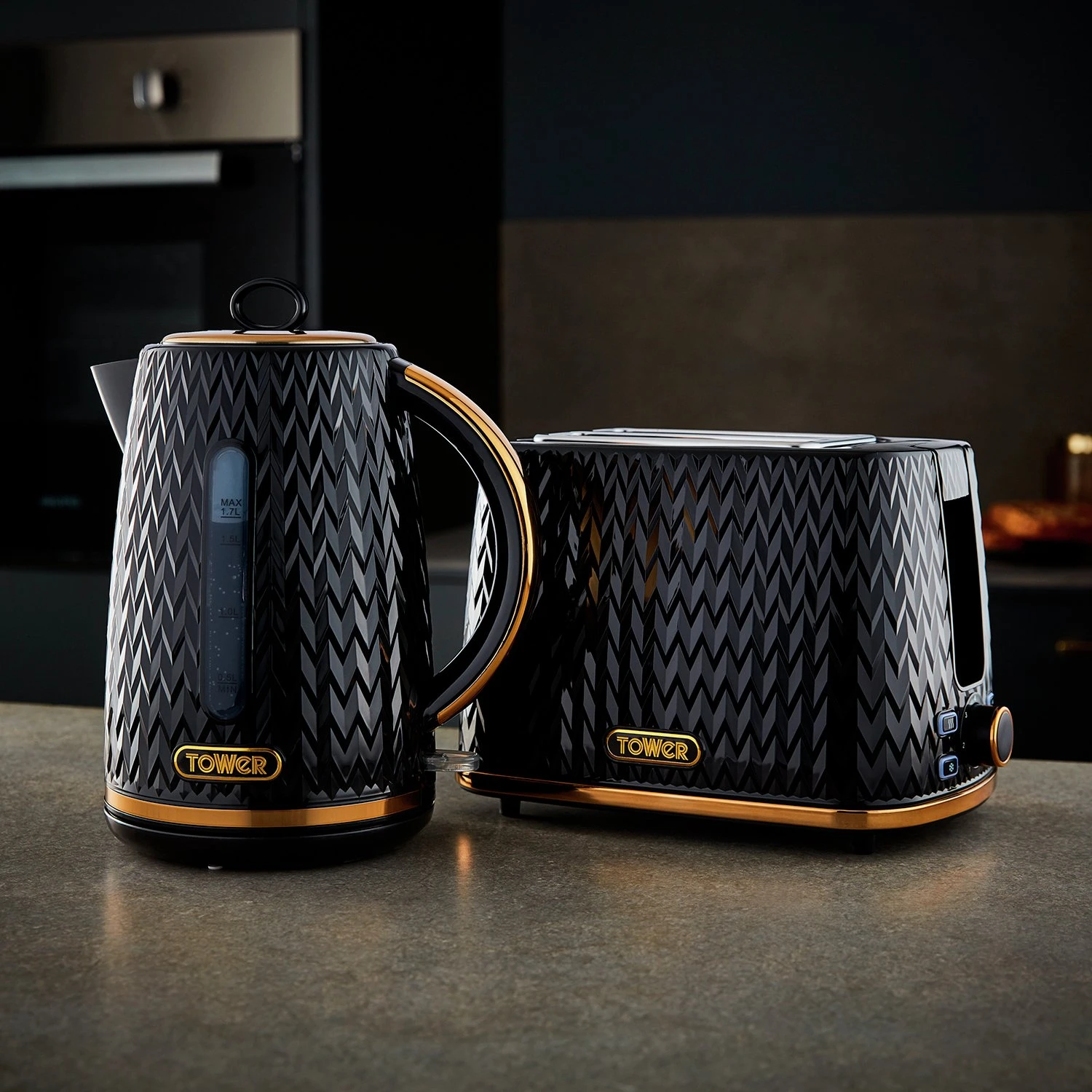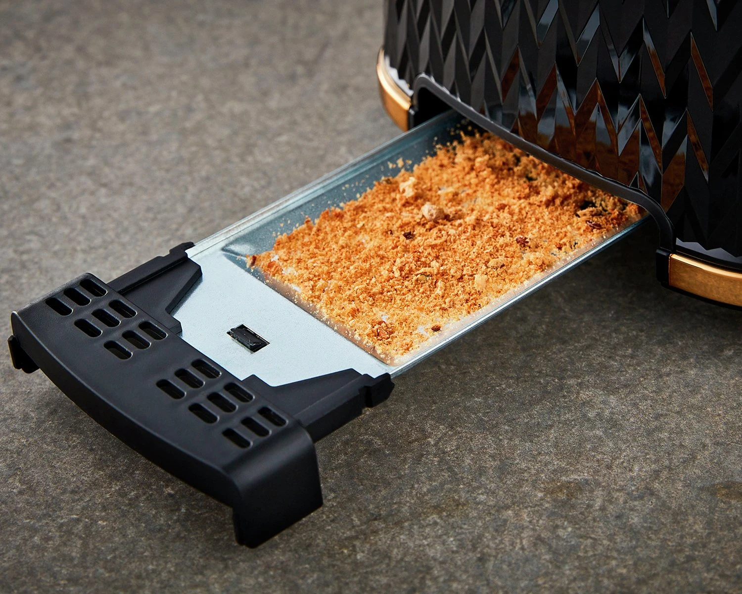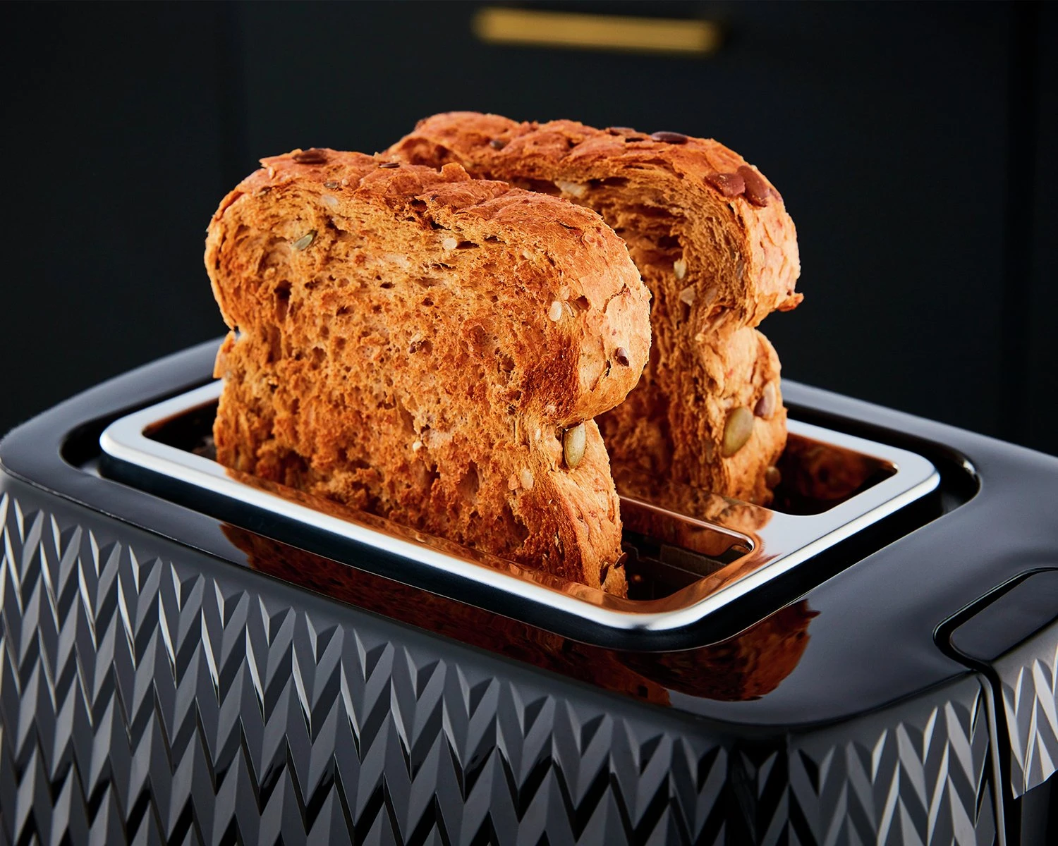Empire patterned black coated 2-slice toaster with bronze accents. 2 toasting slots provide enough space for various sized loaves; while the adjustable browning control's 7 different settings lets you select your ideal browning consistency. The self-centring function provides even coverage during toasting. The defrost and reheat options provide complete control, with an anti-jam function and an automatic turn off function for safe operation. The removable crumb tray and integrated cord storage provide easy cleaning and neat storage after use.